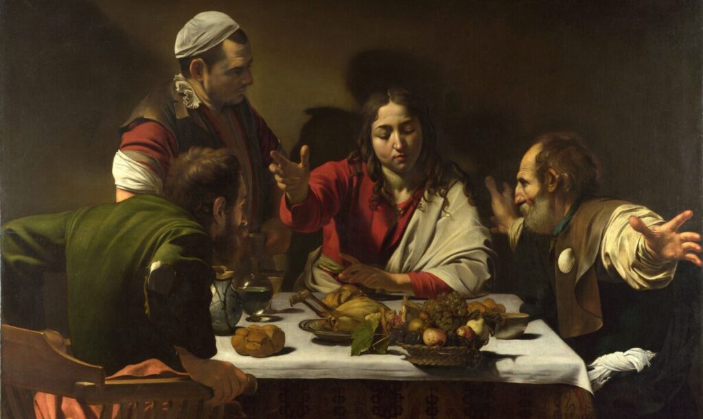 Caravaggio’s incomparable painting captures that precise instant of the disciples recognizing Jesus just before he vanishes, that sudden astonishment. They have had a supernatural experience. Christ himself is present.