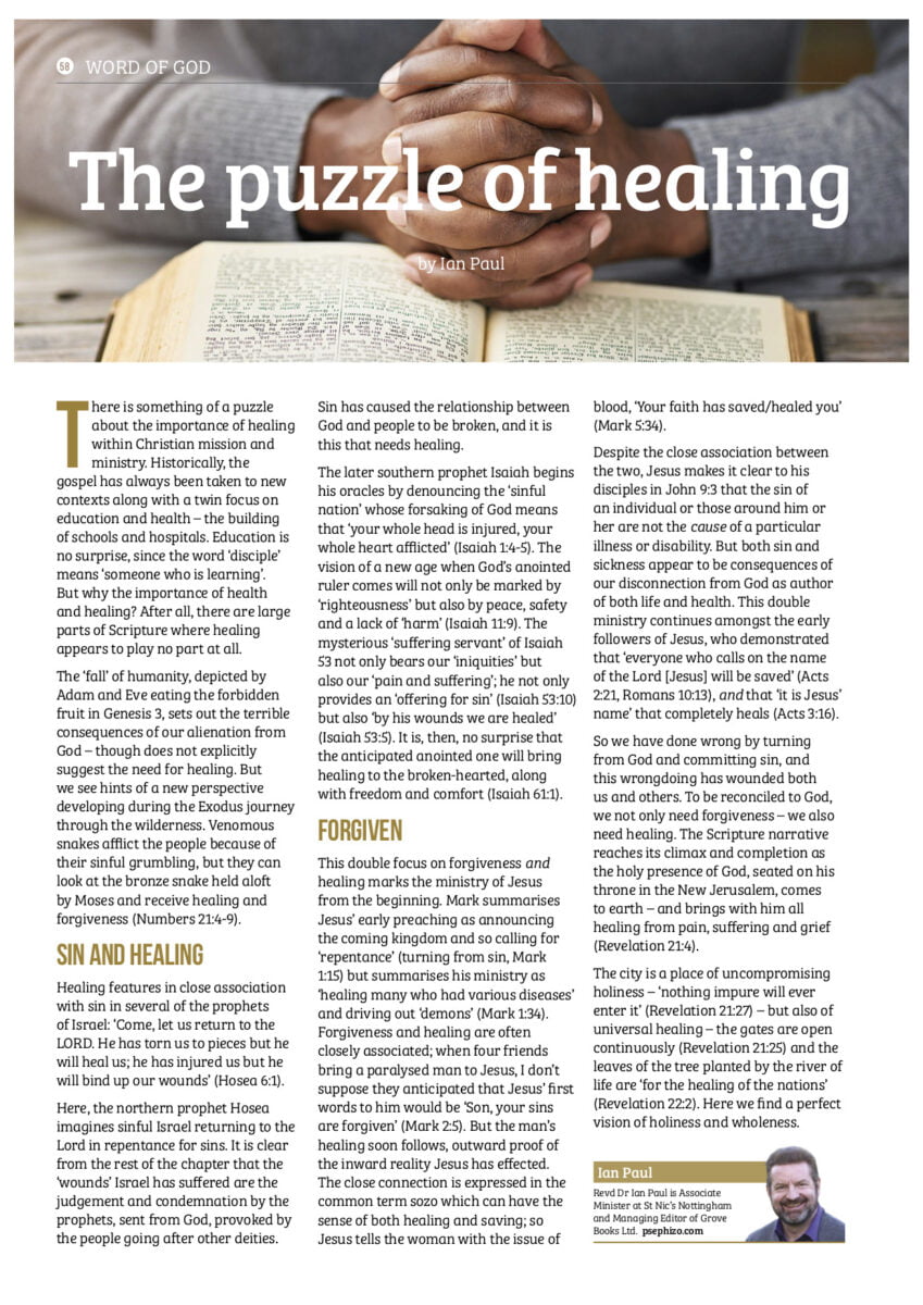 I write a column for Preach magazine, in which I explore a significant word or phrase in the Bible and the ideas that it expresses. The first one was on the phrase ‘Word of God’, and second on ‘Justice’, the third on ‘Mission’ and the fourth on ‘Apocalypse‘. This one, published in Preach Magazine issue 24 Towards Healing, explored the place of healing within the biblical narrative, including some surprising puzzles.